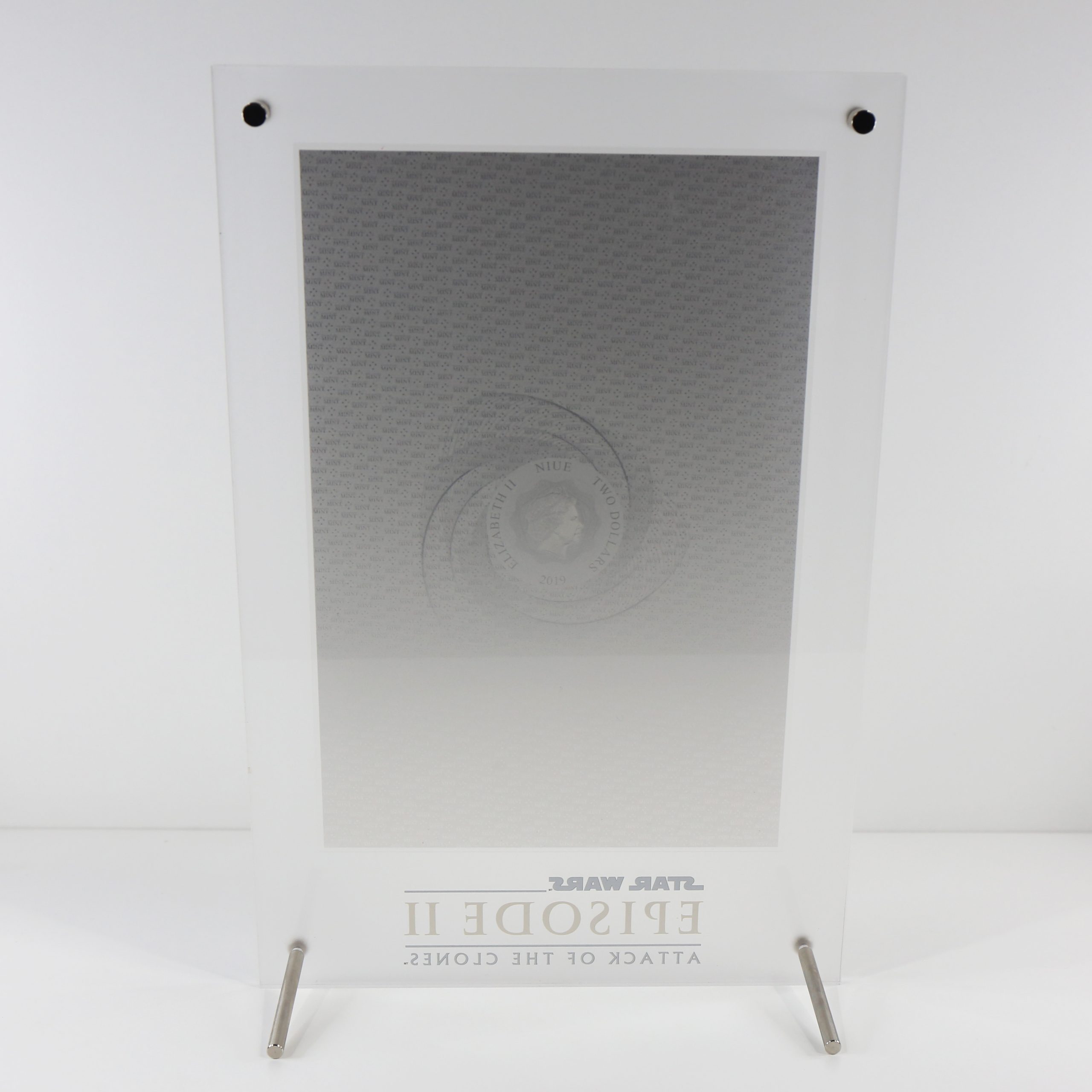 Star Wars Attack Of The Clones Pure Silver Foil Movie Poster In Acrylic Slab Display Stand.